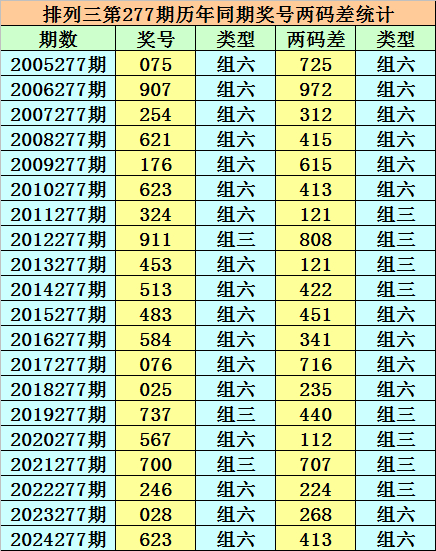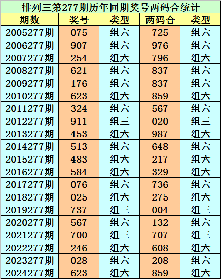排列三从2004年开奖至今已开出7400期奖号了,其中第277期历史同期奖号出现20次,历年第277期分别开出号码:075、907、254、621、176、623、324、911、453、513、483、584、076、025、737、567、700、246、028、623。