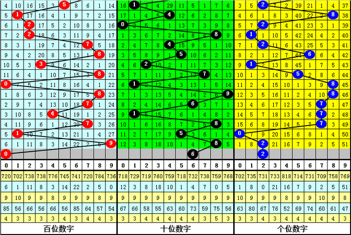 两码合开出频次分别为:7出现12个,8出现8个,0、2出现7个,6、9出现6个,3、5出现5个,1、4出现2个,其中历史同期两码合012路比开出24:16:20,大小比开出37:23,奇偶比开出30:30;