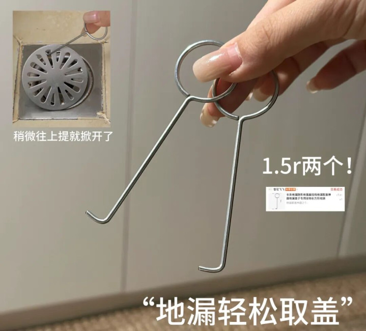 没想到,我妈在拼夕夕上买了这种地漏钩,每次清洁地漏的时候,用这个钩子轻轻一勾,基本就可以把地漏盖钩起来了。