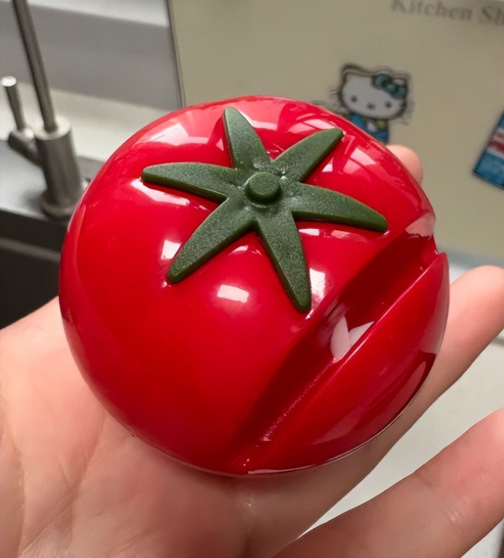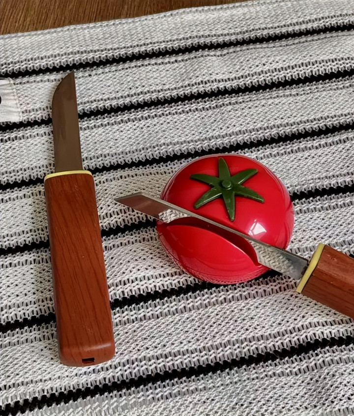 它整体造型是个番茄,平时刀具钝了,把刀具放在磨刀石中间来回几下,基本就可以让刀具重新恢复锋利了。